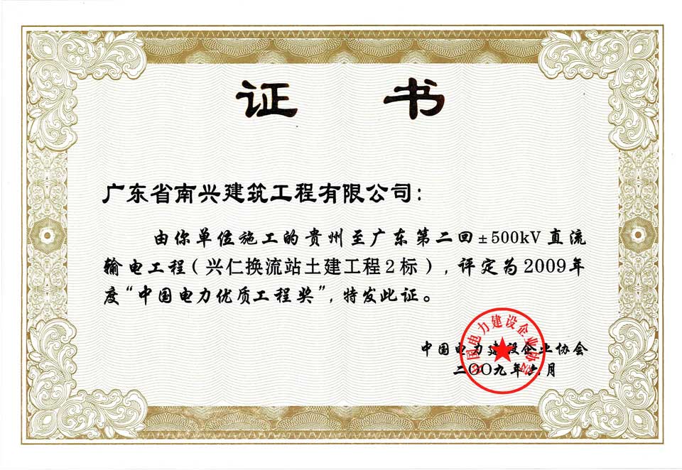 貴州至廣東第二回±500KV直流輸電工程(興仁換流站土建工程2標(biāo))獲優(yōu)質(zhì)工程獎(jiǎng)(2009年)
