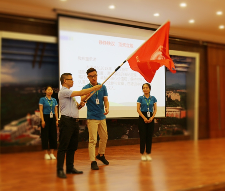 接下來,新學(xué)員代表上臺宣誓并簽署誓詞,承諾嚴(yán)格遵守培訓(xùn)要求、秉承鐵漢核心價(jià)值觀,認(rèn)真學(xué)習(xí)、積極參與,在培訓(xùn)中自我成長。樊杜平接過新學(xué)員簽署的承諾書并授旗,與全體參會人員及學(xué)員齊唱《鐵漢之歌》。